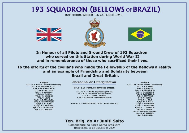 will rest at the Museu Aeroespacial in Rio de Janeiro The unveiling of the plaque will take place on 16th October 2009 at Knightstone Tea Rooms, the plaque being affixed near to the present airfield interpretation board on the wall of the building. Just before the ceremony, at approximately 1pm, there will be a flypast by a Spitfire from the Battle of Britain Memorial Flight. Following this, the Brazilian Air Attache, Colonel Estevam, will perform the unveiling. He will be accompanied by his personal assistant and by a Colonel from the Brazilian Aeronautical Commission. The itinerary for the day is as follows: 1230 - arrive; meet people; view Harrowbeer photo display. 1300 - Flypast by a Spitfire
